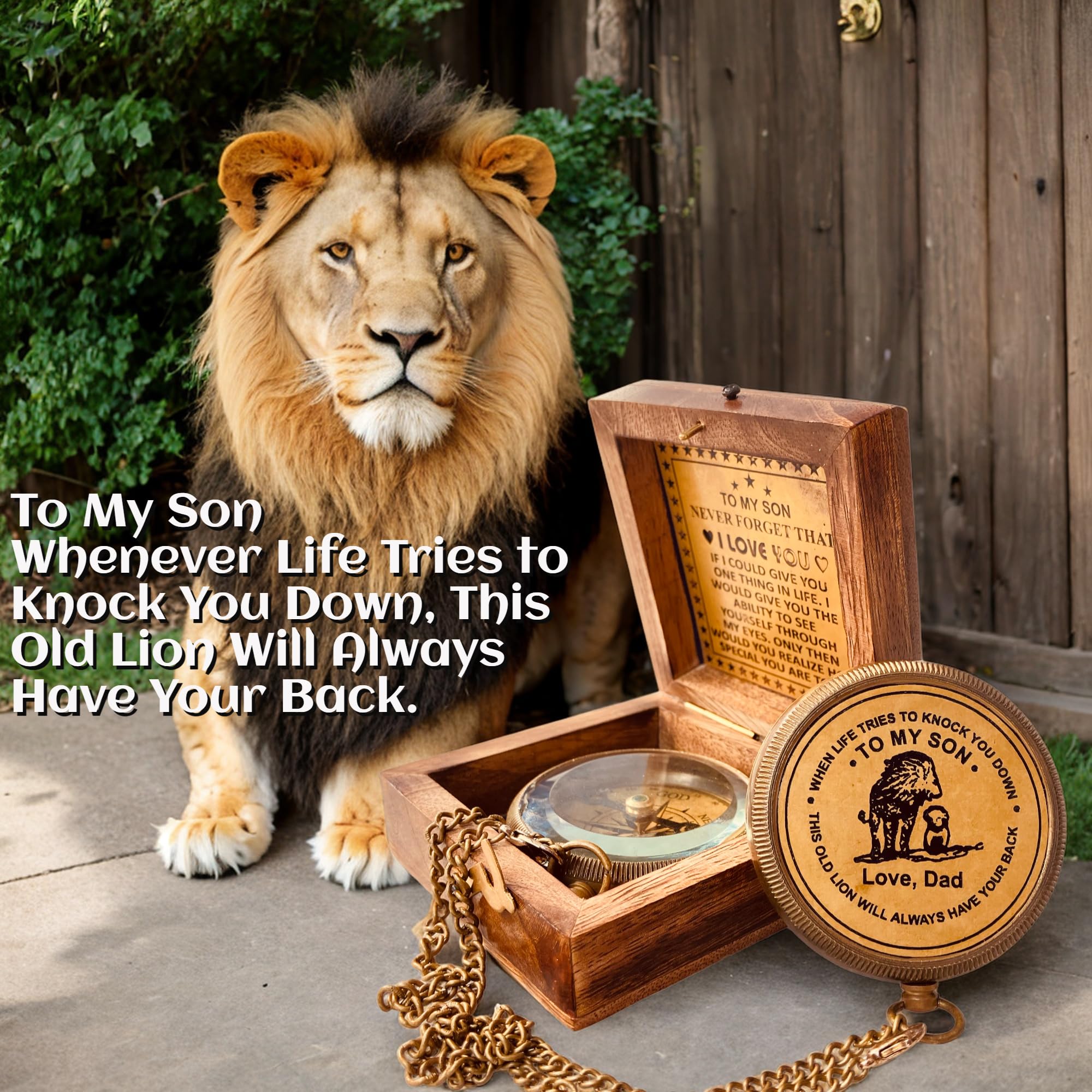 • Appreciation Gift for Son from Father /Dad / Papa / Daddy : Meaningful sentimental quote engraved " When Life Tries To Knock You Down , This Old Lion will Always Have Your Back. " Powerful, Uplifting , inspirational supportive motivational quote engraved on a functional directional compass that gives you direction in Life.
